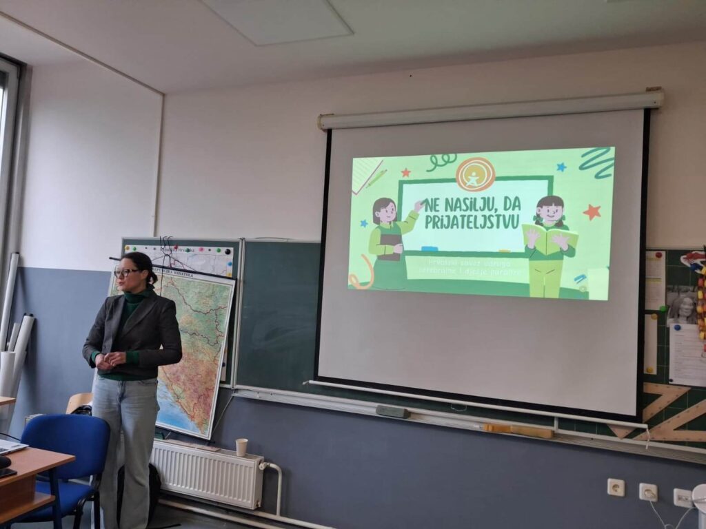 Stručna suradnica Hrvatskog saveza udruga cerebralne i dječje paralize, Ana Kanjera, najprije je učenicima održala interaktivnu prezentaciju pod nazivom Ne nasilju – da prijateljstvu. Učenike je upoznala s Konvencijom o pravima djeteta te im objasnila razliku između sukoba i nasilja. Izlaganje je završila kratkim animiranim filmom, pod nazivom Virtus, koji slikovito dočarava problematiku digitalnog nasilja te zaključnim napomenama o važnosti tolerancije. Tijekom izlaganja se razvila živahna rasprava, u kojoj su učenici iznosili svoja viđenja o pravima djeteta.